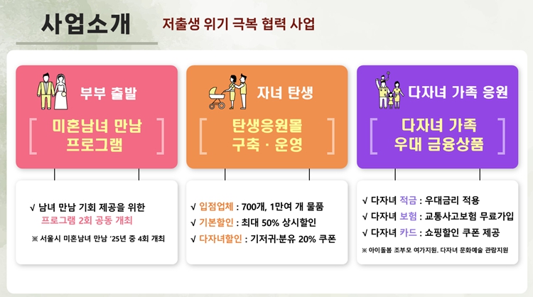 서울시와 신한금융의 협력사업은 크게 3개 분야다. ①'결혼출발' 미혼남녀 만남기회 제공을 위한 공동 프로그램 개최 ②'자녀탄생' 육아용품 특화 할인몰 ‘탄생응원몰’ 개설·활성화 ③'다자녀가족 응원' 우대 카드·금융상품 출시 및 이벤트 개최로, 30만여 명의 시민들에게 혜택이 돌아갈 수 있을 것으로 전망된다.