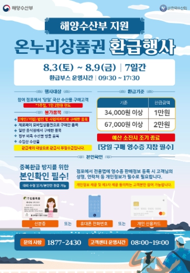 해양수산부 지원으로 수산물 체감물가 안정과 소비 활성화를 위해 진행되며 ▲결제금액 3만 4천 원 이상 구매 시 1만 원 ▲6만 7천 원 이상 구매 시 2만 원 상당의 온누리상품권을 받을 수 있다.
