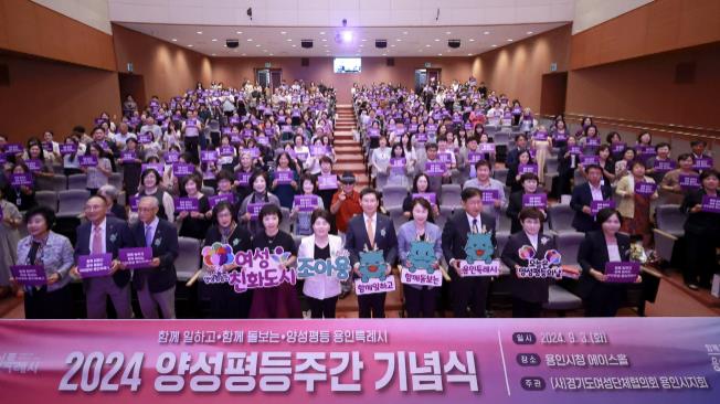 시는 양성평등주간(9월 1일~7일)을 기념해 매년 양성평등에 대한 의미를 알리고 공감대를 형성하기 위한 기념식을 여는데, 올해 주제는 ‘함께 일하고, 함께 돌보는 양성평등한 용인특례시’로 정했다.