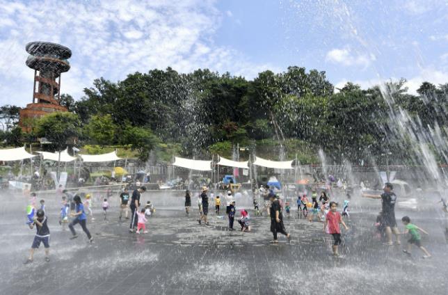 | ▲ 수원시 광교호수공원 바닥분수에서 시민들이 무더위 속 물놀이를 즐기고 있다. |