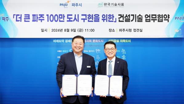 파주시는 지난 9일 시청 접견실에서 김경일 파주시장과 장덕배 한국기술사회장이 참석한 가운데 ‘더 큰 파주, 100만 도시 구현 및 현안 사업 기술협력’을 위한 업무 협약을 체결했다.