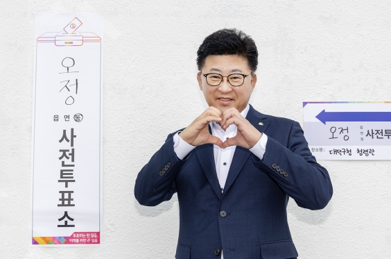 | ▲ 최충규 대덕구청장이 5일 대덕구청 청렴관 사전투표소 앞에서 제22대 국회의원 선거 사전투표를 완료한 후 기념 촬영을 하고 있다. |