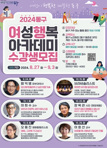 여성 인재 양성을 위해 마련된 동구 여성 행복아카데미는 다양한 분야의 초청 강연으로 구성된 교육 프로그램으로 오는 9월 24일부터 10월 29일까지 총 6회에 걸쳐 진행된다.