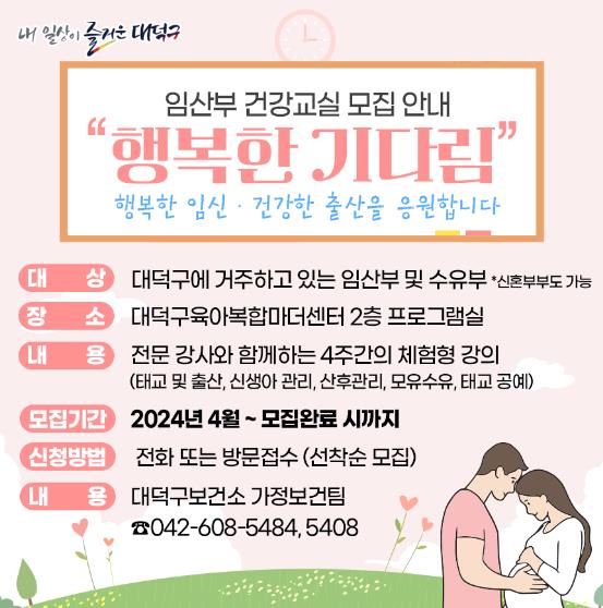 [뉴스서울] 대전 대덕구는 지역 내 임산부·수유부·신혼부부 등을 대상으로 임산부 건강교실 프로그램 ‘행복한 기다림’ 3기 대상자를 모집한다고 밝혔다.