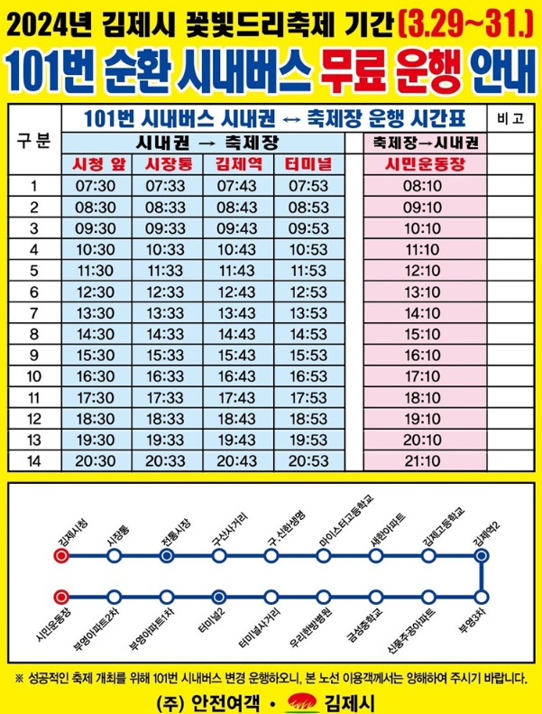 ▲ 김제시, 꽃빛드리 축제 기간 101번 시내버스 무료 운행 |