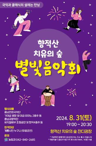 [뉴스서울] 계룡시는 오는 31일 오후 7시부터 향적산 치유의 숲 잔디광장에서 ‘향적산 치유의 숲 별빛음악회’를 개최한다고 밝혔다.