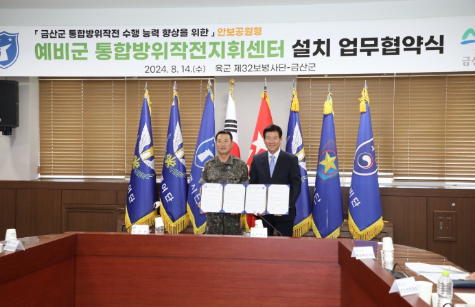 [뉴스서울] 금산군은 지난 14일 육군 제32보병사단과 금성면 도곡리 186-5 일원 부지를 활용한 주민 친화형 안보공원 및 예비군 통합방위작전지원센터 조성하기 위한 업무협약을 체결했다.
