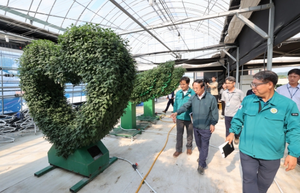 지난 4일 화분 국화와 현애 조형물 생산 현장을 점검한 심 민 군수는 장마와 무더위 속에서 국화 생산 관리에 고생하고 있는 관계자들을 격려했다.