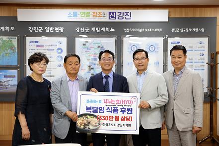 강진원 강진군수는 “긴 장마에 건강 취약계층인 아이와 어르신들을 위해 복달임 식품을 기탁한 효도회 회원들게 감사드린다”며 “시대에 맞는 맞춤형 소통으로 세대 간 거리를 한 발짝 좁혀나가는 의미 있는 기회를 만들도록 군에서도 다양한 정책을 펼치도록 노력하겠다”고 말했다