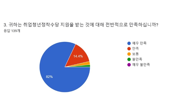 이번 설문조사는 지난 6월 20일부터 28일까지 9일 동안 진행됐으며 취업청년 정착수당 지원 참여자 232명 중 139명이 참여(응답율 59%)했다. 시는 취업청년 정착수당 지원 만족도 조사 등 17문항을 정해 구글 폼 설문조사를 활용해 설문을 진행했다.