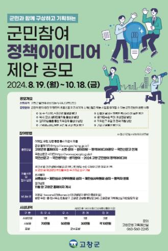 군민참여 정책아이디어 공모는 10월18일까지 지역 경제 활성화 방안, 복지공동체 실현 방안, 지역인구 유입 및 정착 지원 방안 등 군정 전반을 대상으로 군민들의 참신한 아이디어를 접수한다.