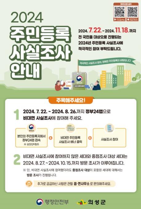 주민등록 사실조사는 주민의 실거주지와 주민등록상 거주지의 일치 여부를 조사하는 것으로 8월 26일까지는 정부24 앱을 통한 비대면 조사를 실시하고, 이후 8월 27일부터 비대면 조사에 참여하지 않은 세대 및 중점 조사 대상은 마을 이장과 담당 공무원의 방문 조사를 받으면 된다.