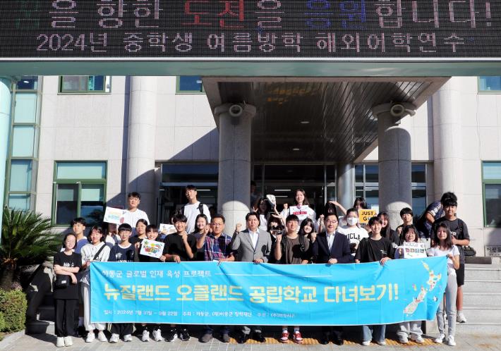 하동군장학재단은 지난 31일 관내 중학생 25명이 8월 1일부터 22일까지 진행되는 어학연수를 위해 뉴질랜드 북부 오클랜드로 출발했다고 밝혔다.