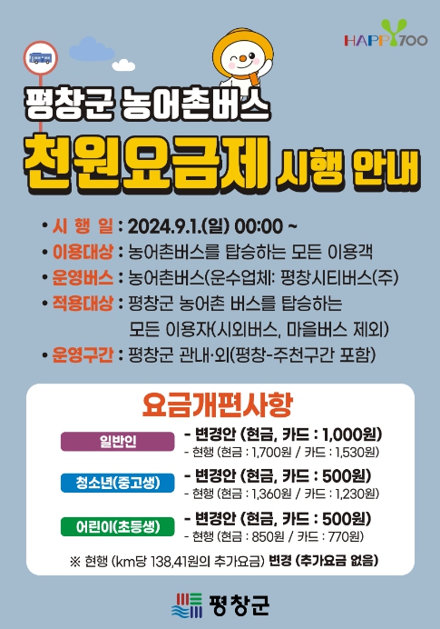 군은 농어촌버스 운송 사업자인 (주)평창시티버스와 농어촌버스 운임에 대한 단일요금제 협의를 완료했으며, 주민들은 9월부터 평창군 관내를 운행하는 농어촌버스를 1,000원에 이용할 수 있게 된다고 밝혔다.