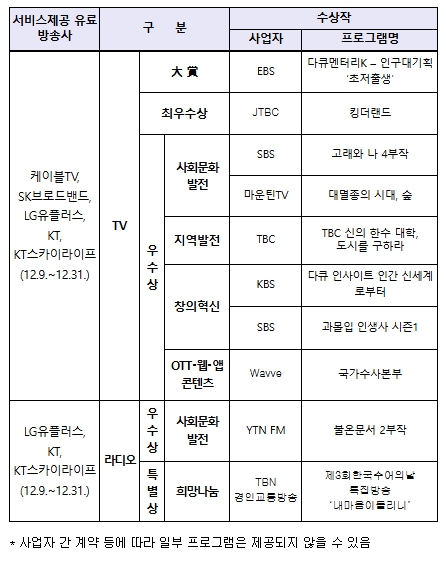 이번 특별관은 대상작인 ▲EBS 다큐멘터리K ‘인구 대기획 '초저출생'’을 비롯하여 최우수상 수상작(▲JTBC 드라마 ‘킹더랜드’)과, 우수상 수상작(▲SBS ‘고래와 나’, ▲마운틴TV ‘대멸종의 시대, 숲’, ▲TBC ‘TBC 신의 한수 대학, 도시를 구하라’, ▲KBS ‘다큐 인사이트 인간 신세계로부터’, ▲SBS ‘과몰입 인생사 시즌1’, ▲Wavve ‘국가수사본부’, ▲YTN FM ‘불온문서’, ▲TBN경인교통방송 ‘내 마음이 들리니’) 총 10편으로 제공될 예정이다. 프로그램들은 위 유료방송의 ‘TV 다시보기’ 메뉴를 통해 시청할 수 있다.