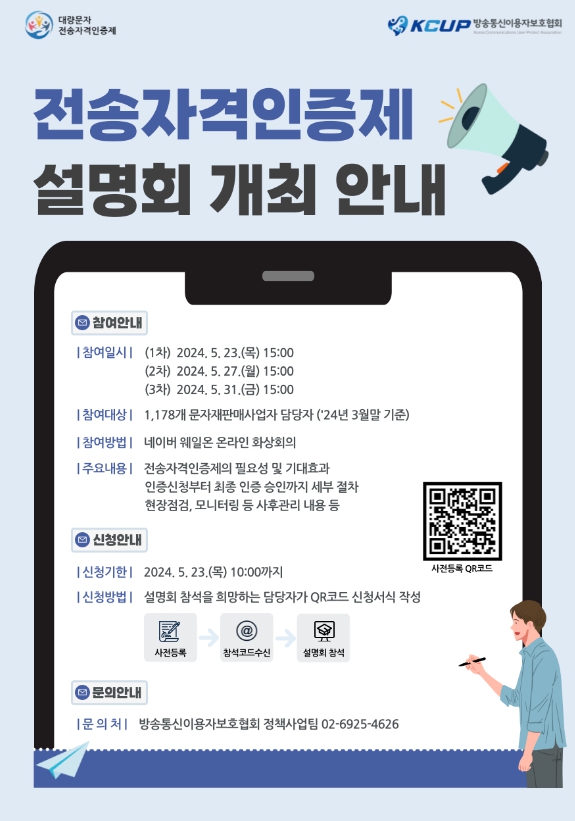 또한, 사전 설명회에 참석하지 못한 사업자는 ’24.5.30.부터 전송자격인증제 누리집 및 유튜브 채널(“전송자격인증제”)을 통해서도 상세한 설명을 확인할 수 있다.