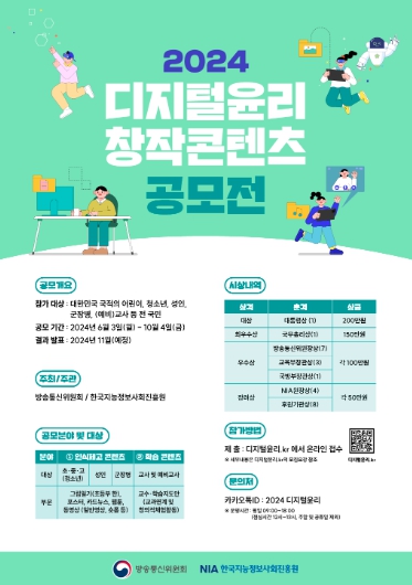 공모전은 디지털윤리에 관심이 있는 초·중·고 청소년, 성인, 군장병, 교사, 예비교사 등 대한민국 국민 누구나 참여할 수 있다. 출품작은 심사를 거쳐 ▲대통령상 1점, ▲국무총리상 1점, ▲방통위원장상 7점, ▲교육부장관상 3점, ▲국방부장관상 1점, ▲주관기관 및 후원기관장상 12점 등 총 25점을 선정하며, 올해 12월에 개최되는 ‘2024년 디지털윤리대전’을 통해 시상할 예정이다.