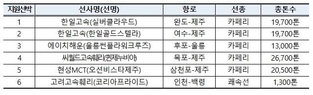 해양수산부는 노후 연안여객선의 신조를 지원하기 위해 2016년부터 현대화 펀드를 조성하여 운영하고 있다. 올해는 연안화물선까지 지원 대상을 확대했고, 지난 5월, 9월 두 차례 공모를 통해 지원대상 사업자로 8개 연안해운선사(연안화물선 7척, 연안여객선 1척)를 선정한 바 있다.