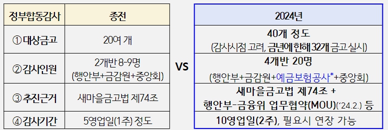 이번 합동감사는 지난 2월 행정안전부-금융위원회가 체결한 ‘새마을금고 건전성 강화 협력체계 강화를 위한 업무협약’의 후속조치로,행정안전부-금융감독원-예금보험공사-새마을금고중앙회가 협업하여 실시하는 정부합동감사로, 대상금고(20개→40개), 감사인원(8~9명→20명), 감사기간(1주, 5영업일 → 2주, 10영업일) 확대 등을 통해 지역금고에 대한 감사를 대폭 강화한다는 점에서 그 의미가 크다.