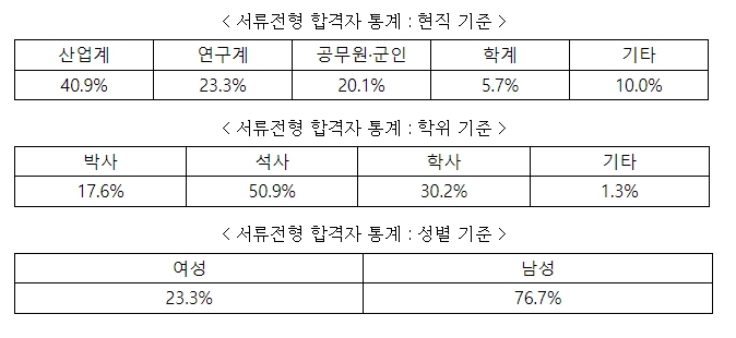 서류전형 합격자 통계를 살펴보면 산업계 40.9%, 연구계 23.3%, 공무원·군인 20.1%, 학계 5.7%, 기타 10.0%를 차지하며, 학위별로는 박사 17.6%, 석사 50.9%, 학사 30.2%, 기타 1.3% 비중을 차지하였다. 성별은 여성이 23.3%, 남성이 76.7%다.