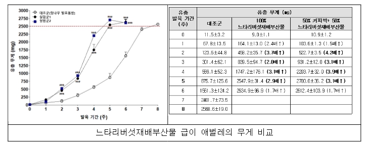 ▲ 느타리버섯재배부산물 활용 먹이원 급이 흰점박이꽃무지 애벌레의 발육 특성 |