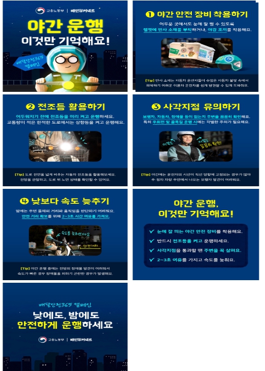 첫 캠페인 주제는 ‘야간운행 안전수칙’으로 야간 운행 시안전장비 착용,저속 운행,사각지점 꼼꼼히 살피기 등을 카드뉴스로 제작하여 배민 중개 앱 등을 통해 중점 안내하고 있으며(4월~), 5월부터 고용노동부 누리소통망(SNS) 등에도 게시될 예정이다.