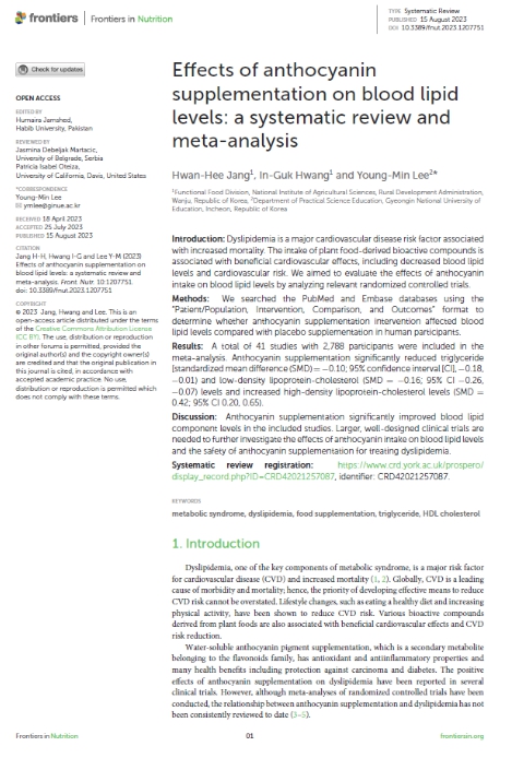 연구진은 안토시아닌 섭취 관련 연구 결과들을 종합해 최종적으로 안토시아닌 효과를 검증했다. 2023년 6월까지 보고된 안토시아닌 관련 국내외 임상 연구 336건 중 지질개선 효과를 확인한 연구 41건(총 2,788명 참여)을 대상으로 했다.