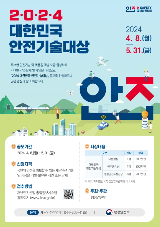 [뉴스서울] 행정안전부는 4월 8일부터 5월 31일까지'2024 대한민국 안전기술대상' 후보를 공개모집 한다.