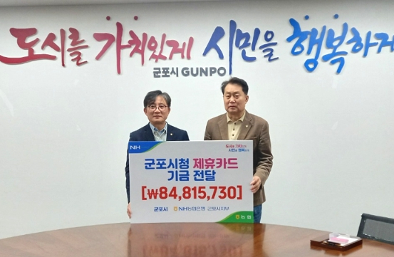 [뉴스서울] 군포시는 15일 오전 NH농협은행(군포시청출장소)로부터 2023년도분 제휴카드 적립 기금 84,815천원을 전달받는 기금 기탁식을 치뤘다.