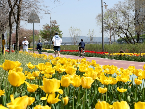[뉴스서울] 서울 성동구 중랑천 산책로 2km 구간(용비교~중랑천, 청계천 합류부)에 튤립이 만개해 완연한 봄을 알리며 주민들의 발길이 이어지고 있다.