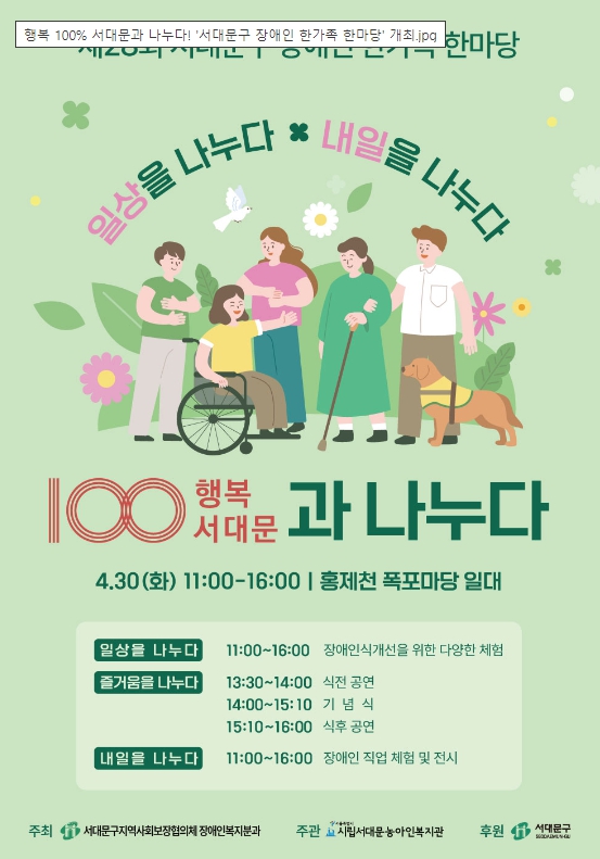 [뉴스서울] 서대문구는 제44회 장애인의 날(4/20)을 기념해 이달 30일 오전 11시부터 오후 4시까지 홍제천 폭포마당 일대에서 ‘장애인 한가족 한마당’이 열린다고 밝혔다.