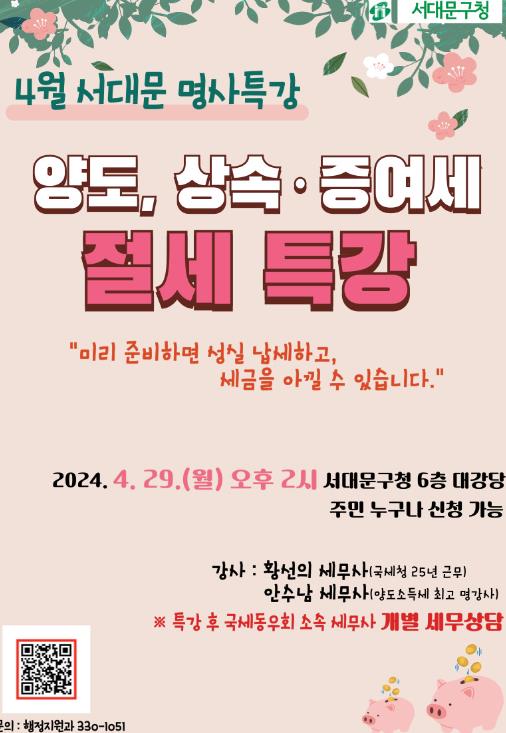 이성헌 서대문구청장은 “세금에 대한 고민 해결에 도움이 될 수 있도록 이번 특강을 마련했으며 앞으로도 주민 생활에 실질적 보탬이 되는 명사 특강을 열어 가겠다”고 말했다.