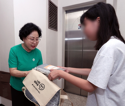 ▲ 동작구 신대방1동 29통장 김정숙 씨가 지역 내 맞벌이 가정 초등학생에게 도시락을 지원하는 사업에 동참하고자 사랑의 배달부를 자청했다. 사진은 지난 30일 대상 초등학생에게 도시락을 전달하고 있는 모습 |