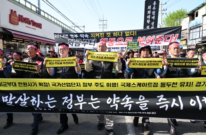 이에 범대위와 동두천시민은 지난 2023년부터 총궐기대회로 맞대응하며 전방위 압박에 나섰다. 2023년 12월 13일, 생업도 포기한 채 800여 명이 용산 국방부 청사 앞에서 동두천 지원 대책 이행을 촉구했다. 12월 28일에는 미군기지 반환에 동두천이 제외된 것을 규탄하기 위해 미군기지 반환 촉구 성명서 발표와 함께 기자회견을 개최했다. 그리고 얼마 전인 4월 18일, 범대위와 사회단체원, 시민 등 2,000명이 미2사단 정문 앞으로 달려가 동두천 국가산단 국가 주도 추진 등 동두천 요구안을 외치며 궐기대회를 대대적으로 전개했다. 이날 동두천시민이 보여준 굳은 의지를 많은 방송사와 신문사에서 취재하는 등 집중 조명을 받았다.
