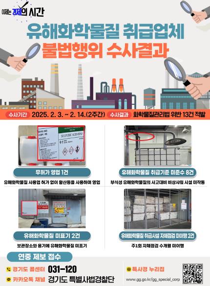 [뉴스서울] 경기도는 유해화학물질 취급업체 불법행위를 수사해 무허가 영업, 취급기준 미준수 등 총 13건의 불법행위를 적발했다고 밝혔다.