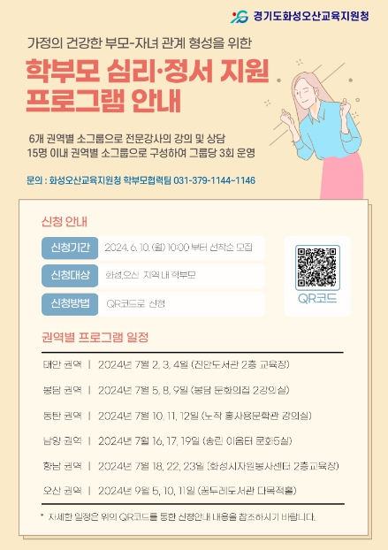 [뉴스서울] 화성오산교육지원청은 오는 7월부터 9월까지 관내 학부모를 대상으로 심리·정서 지원 프로그램을 운영하며, 이에 참여할 학부모를 선착순으로 모집한다.