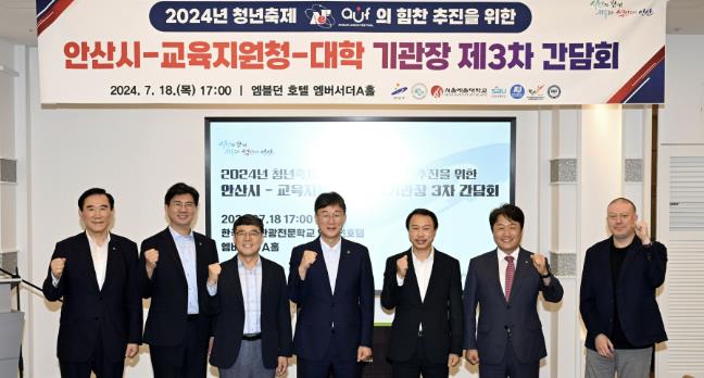 안산시는 지난 18일 엠블던호텔에서 안산교육지원청, 관내 5개 대학(▲서울예술대학교 ▲신안산대학교 ▲안산대학교 ▲한국호텔관광전문학교 ▲한양대학교 ERICA 캠퍼스)의 기관장들이 함께 모여 청년 축제 지원을 주제로 간담회를 개최했다고 19일 밝혔다.