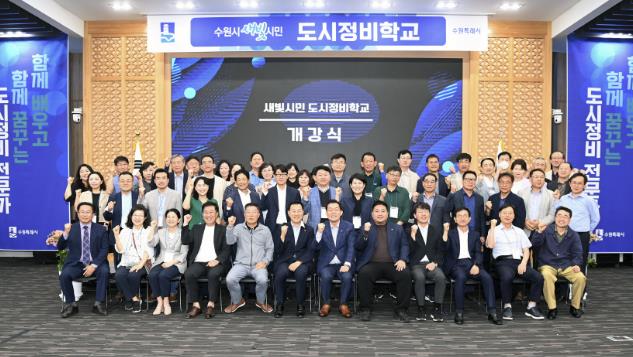 | ▲ 수원시가 도시정비사업 관련 전문교육을 위해 진행한 ‘새빛시민 도시정비학교’ 개강식에서 참석자들이 기념촬영을 하고 있다. |