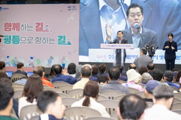 17일 수원종합운동장 수원체육관에서 열린 ‘제44회 수원시 장애인의 날 기념식‧복지박람회’에서 환영사를 한 이재준 시장은 “수목원, 행정복지센터, 도서관, 문화센터, 놀이터 등 시민들이 이용하는 모든 곳의 ‘차별과 장벽’을 허물고자 노력하고 있다”며 “장애가 걸림돌이 되지 않고, 모든 사람이 일상을 누릴 수 있도록 세심하게 정책을 마련하고 지원하겠다”고 밝혔다.