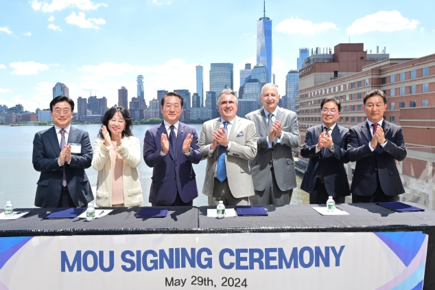 ▲ 유정복 인천광역시장(왼쪽 세번째)이 지난 5월 29일(현지시간) 미국 뉴저지에서 부동산 개발사 파나핀토 글로벌 파트너스, 대한항공 등과 영종도 내 항공복합문화시설 건립을 위한 양해각서를 교환했다. |