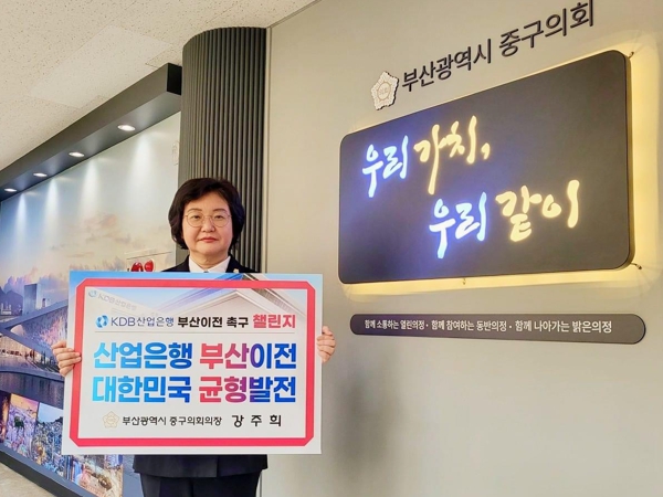 [뉴스서울] 부산광역시 중구의회 강주희 의장은 지난 24일 KDB 산업은행 부산 이전 촉구를 위한 챌린지에 동참했다.