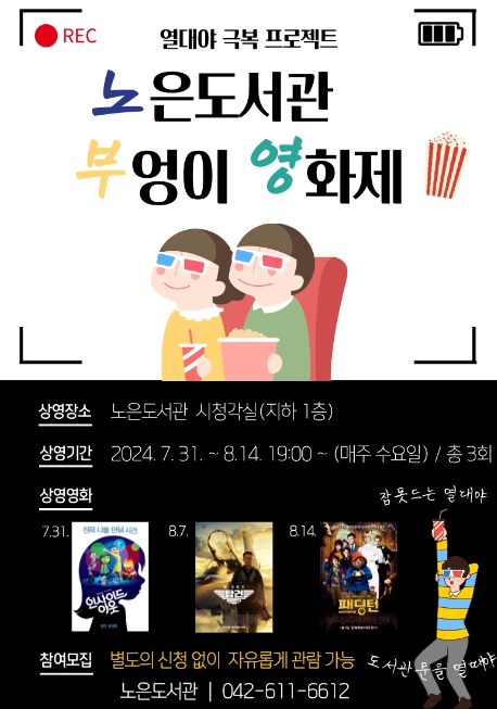 상영영화는 7월 17일부터 19일까지 노은도서관 자료실에 방문한 이용자들의 투표를 통해 ▲(7월 31일) 인사이드 아웃 ▲(8월 7일) 탑건 ▲(8월 14일) 패딩턴 등 성인과 아동 모두가 즐길 수 있는 작품으로 선정됐다.