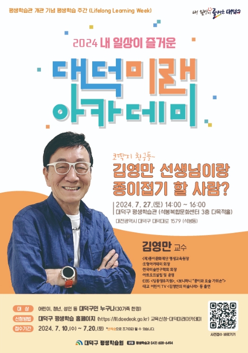 [뉴스서울] 대전 대덕구는 오는 27일 ‘2024년 내 일상이 즐거운 대덕미래아카데미’의 일환으로 ‘종이접기 아저씨’ 김영만 교수를 초청해 강연을 진행한다고 밝혔다.