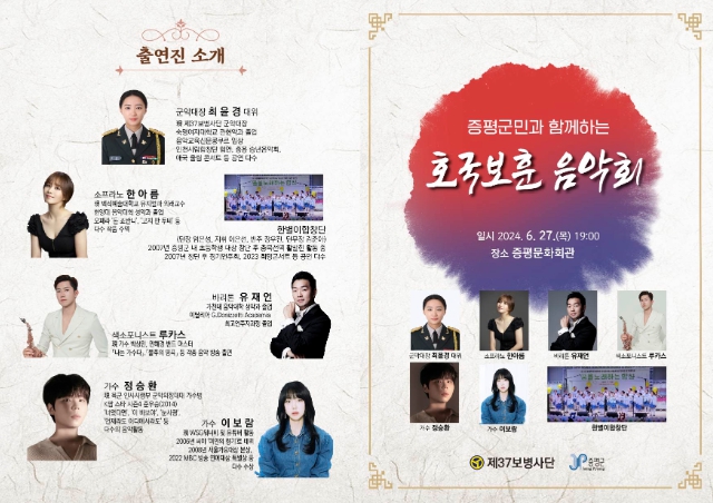 증평군과 제37보병사단이 공동으로 개최하는 이번 공연은 37사단 군악대를 중심으로 ‘전선을 간다’ 등 군가 메들리와 성악가 및 한별이합창단, 색소폰 협연 등 풍성한 무대로 호국의 의지와 화합을 노래한다.
