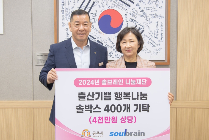 이날 기탁식을 통해 솔브레인나눔재단은 공주시 출생아를 축하하고 저출산 극복을 위해 4천만원 상당의 출산용품 세트(아기띠와 유기농 침받이 400개)를 지원했다.