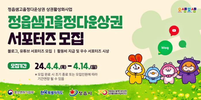 [뉴스서울] 정읍시는 샘고을 정다운상권을 널리 홍보하고 소비자와 소상공인의 소통을 강화하고자 오는 14일까지 상권 서포터즈를 모집한다.