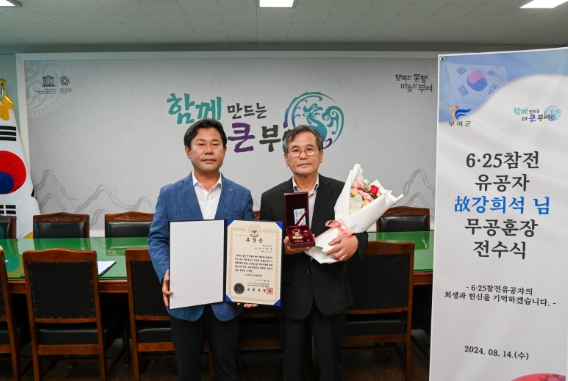 [뉴스서울] 부여군은 지난 14일 군수실에서 6·25전쟁 참전유공자 故강희석님의 무공훈장 전수식을 가졌다.