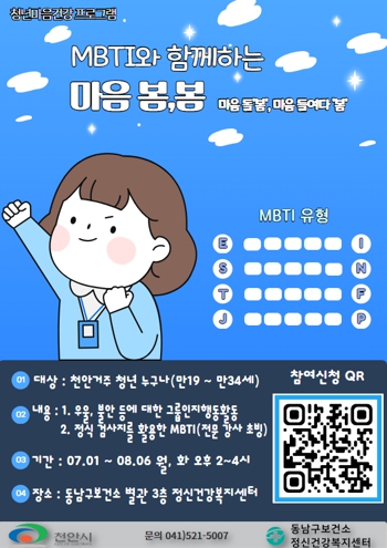 [뉴스서울] 천안시 동남구 정신건강복지센터는 청년들의 정신건강을 지원하기 위해 우울, 불안 등 정신과적 문제를 가진 만 19세~35세 청년을 대상으로 다음달 1일부터 8월 6일까지 ‘마음, 봄봄’프로그램을 운영한다고 밝혔다.