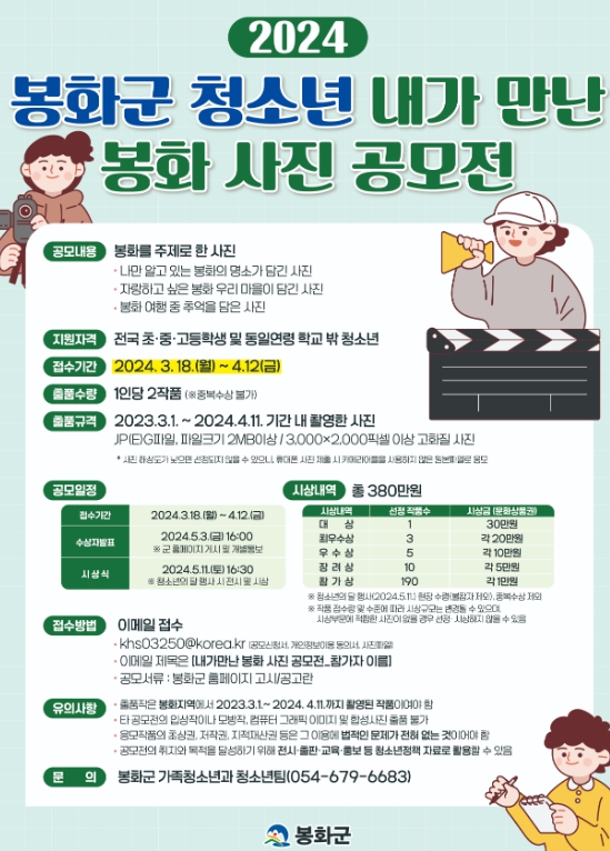 [뉴스서울] 봉화군은 오는 4월 12일까지 2024 봉화군 청소년 내가 만난 봉화 사진 공모전을 개최한다.