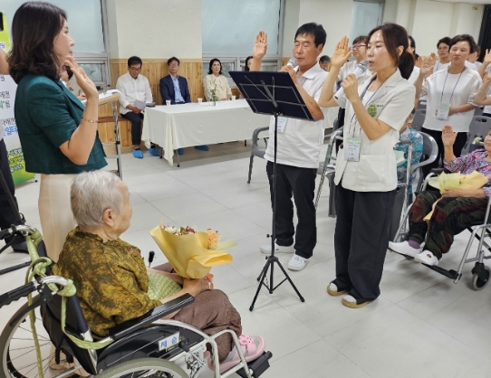 ‘존엄케어 선서식’은 ▲노인학대 ▲절차를 지키지 않는 신체 억제 ▲낙상 ▲욕창 ▲냄새 등 5무(無)를 실천하고, ▲어르신과의 소통 ▲공손한 언행 ▲존경과 배려 등 3유(有)를 실천하자는 내용이 담겼다.